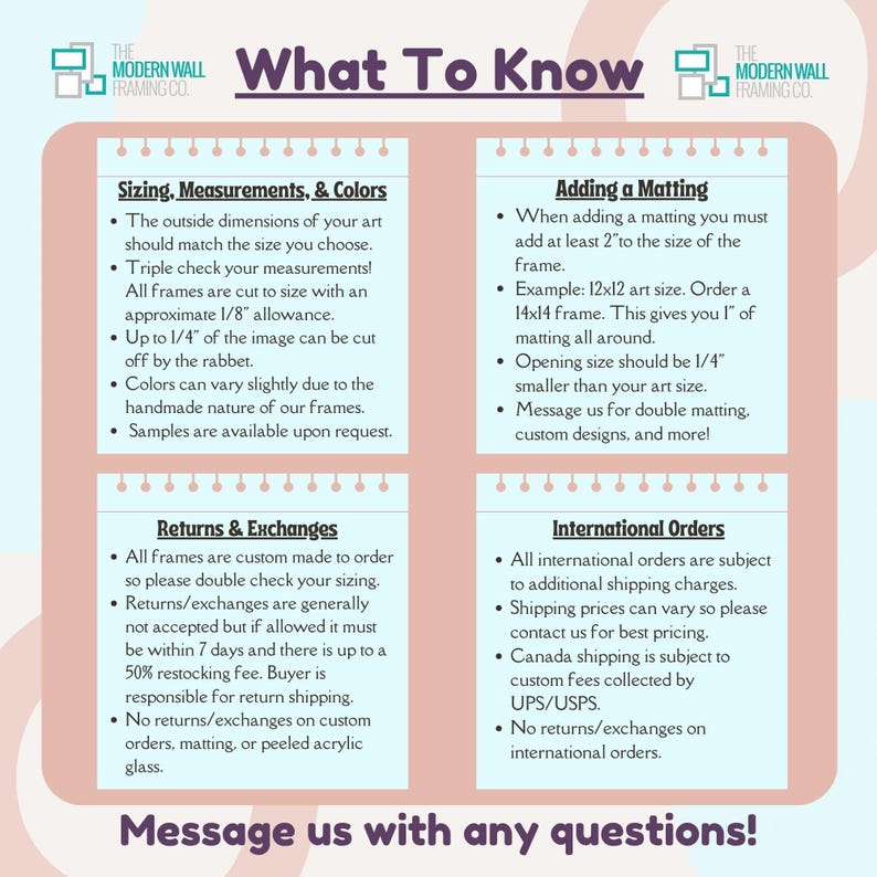 1. Triple check your measurements! The outside dimensions of your artwork should match the frame size you choose. Message us if you need something custom.